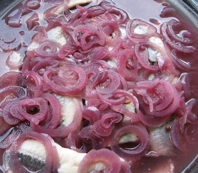 Wenn der Sud erkaltet ist, die Heringe in ein Gefäß legen,