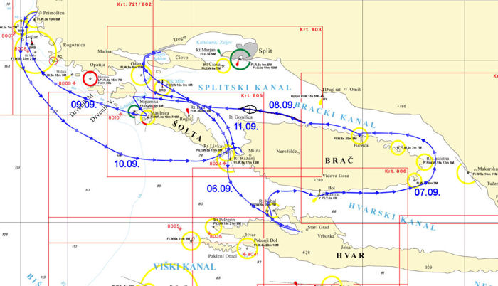 Kartenausschnitt aus "Yacht Navigator" (Delius Klasing - sehr empfehlenswert!) Navigations-Software mit Kartensätzen von Kroatien u.a.. Ich habe als GPS-Empfänger eine Navilock NL-402U (GPS + Galileo) benutzt, super Empfang unter Deck. Finger weg von Bluetooth-Geräten, habe ich im letzten Jahr versucht, läuft nicht so gut wg. der simulierten COM-Schnittstelle, die sich dauernd ändert.! ![]() |